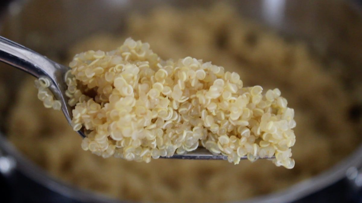 Quinoa starts off as tiny seeds and then cooks into a fluffy, sprouted-looking grainy texture as shown in the photo above.