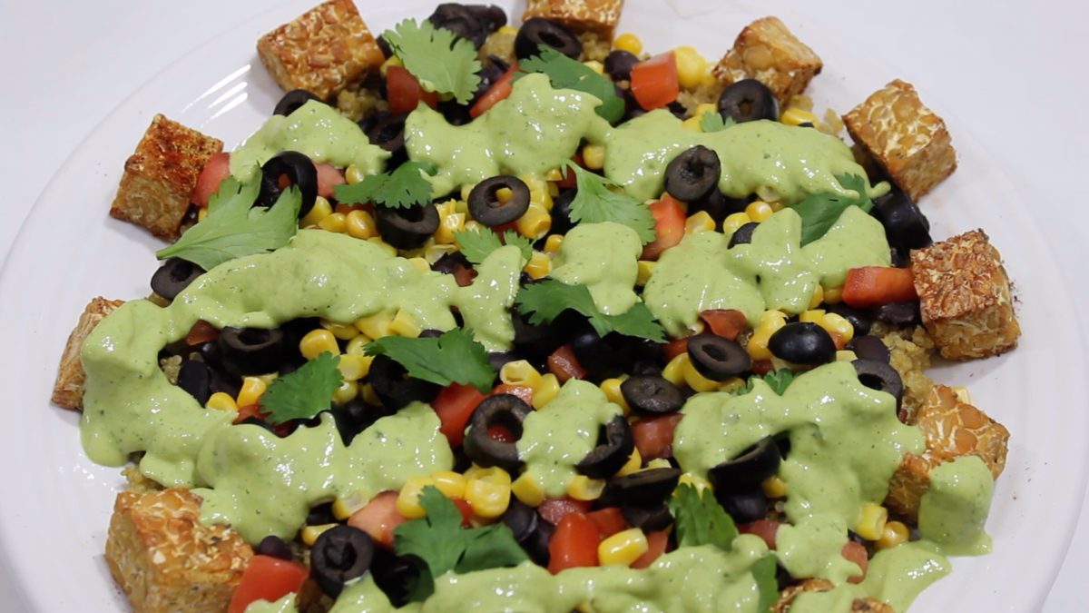 Underneath all the toppings you’ll find some of the beans and quinoa I cooked earlier for this post. I topped it with corn, sliced black olives, diced Roma tomatoes and some cilantro leaves. Then I poured a tasty tahini/cilantro/lime sauce over it all.