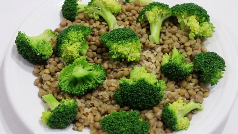 One of my favorite ways to eat lentils is to serve them on a bed of rice, topped with steamed veggies. I’ll often make a nice sauce to pour over it too. The plate above with brown rice, lentils and broccoli has 32 grams of protein. Not too shabby!