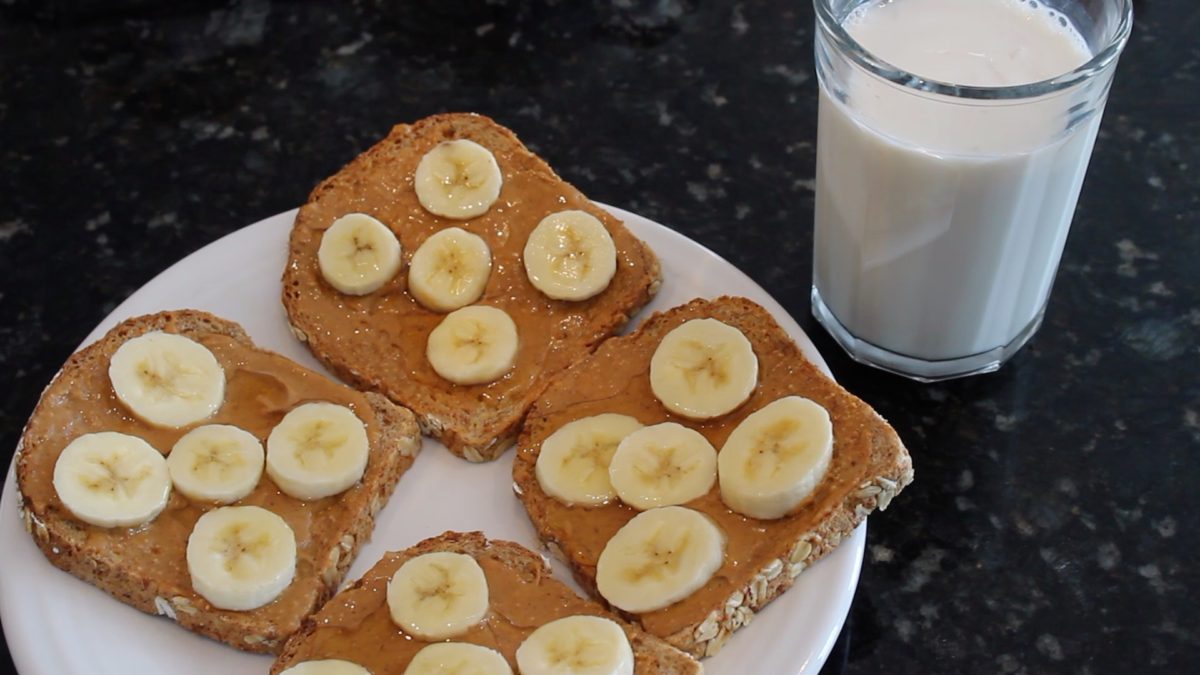 Here’s an example. I took the last 3 items in the above list and put them together to make these peanut butter and honey sandwiches, served with a glass of soy milk. Over 30 grams of protein right there!.